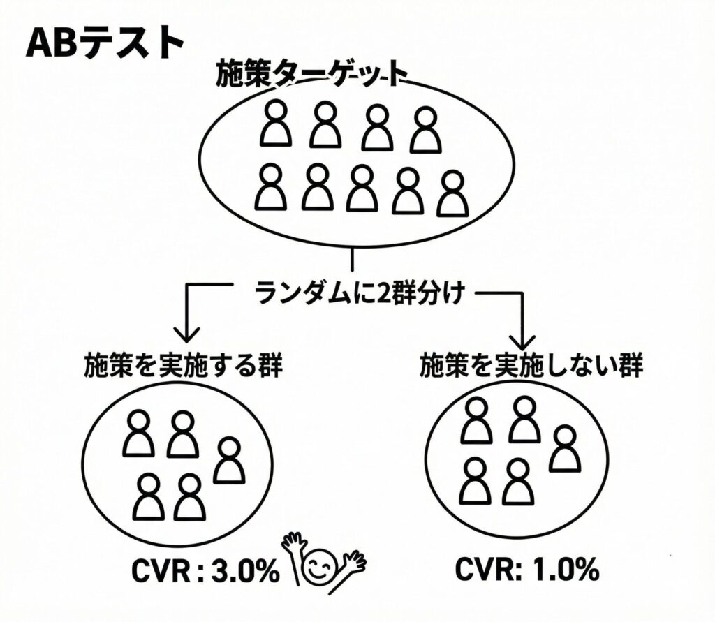 ここで登場するのがABテストという手法です。ABテストとは、「施策を実施するグループ(A群)」と「施策を実施しないグループ(B群)」をランダムに分け、両者を比較することで施策の純粋な効果を測る方法です。