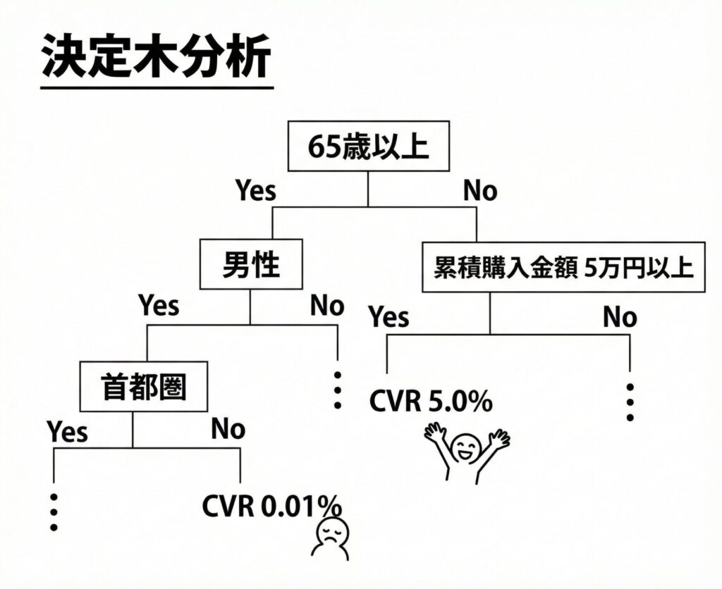一方、お客様の属性情報が多かったり、集計値の閾値が分かりづらい場合には、決定木分析をお勧めします。