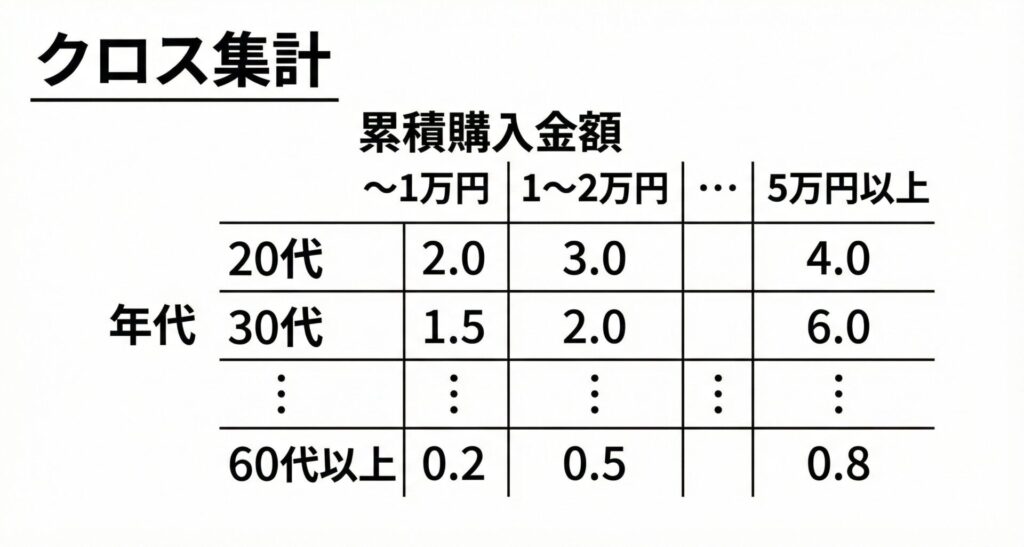一般に分析軸が少ない場合はクロス集計が用いられます。自社でお客様の属性情報を蓄積していない場合に年代と累積購入金額など、限られた分析軸を表頭・表側に設置して、CVRや利益額を集計する方法です。