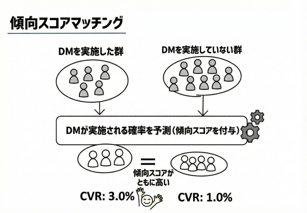 ABテストのように意図的にランダム分けができない場合(例:既に実施済みの過去のDM施策)に使える手法です。「年齢、性別、購買履歴などが似ている顧客同士」を比較することで、あたかもABテストを実施したかのような分析ができます。